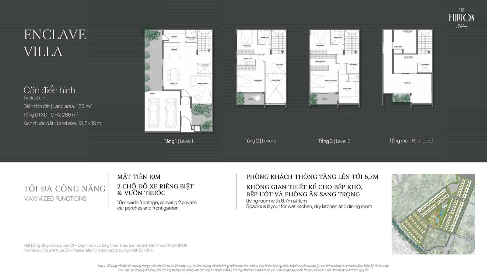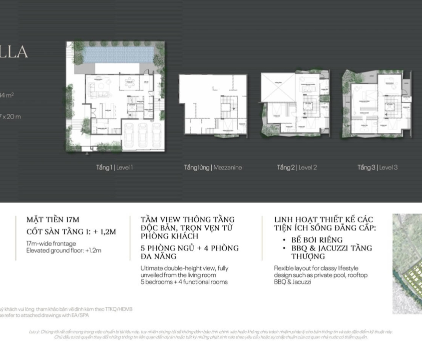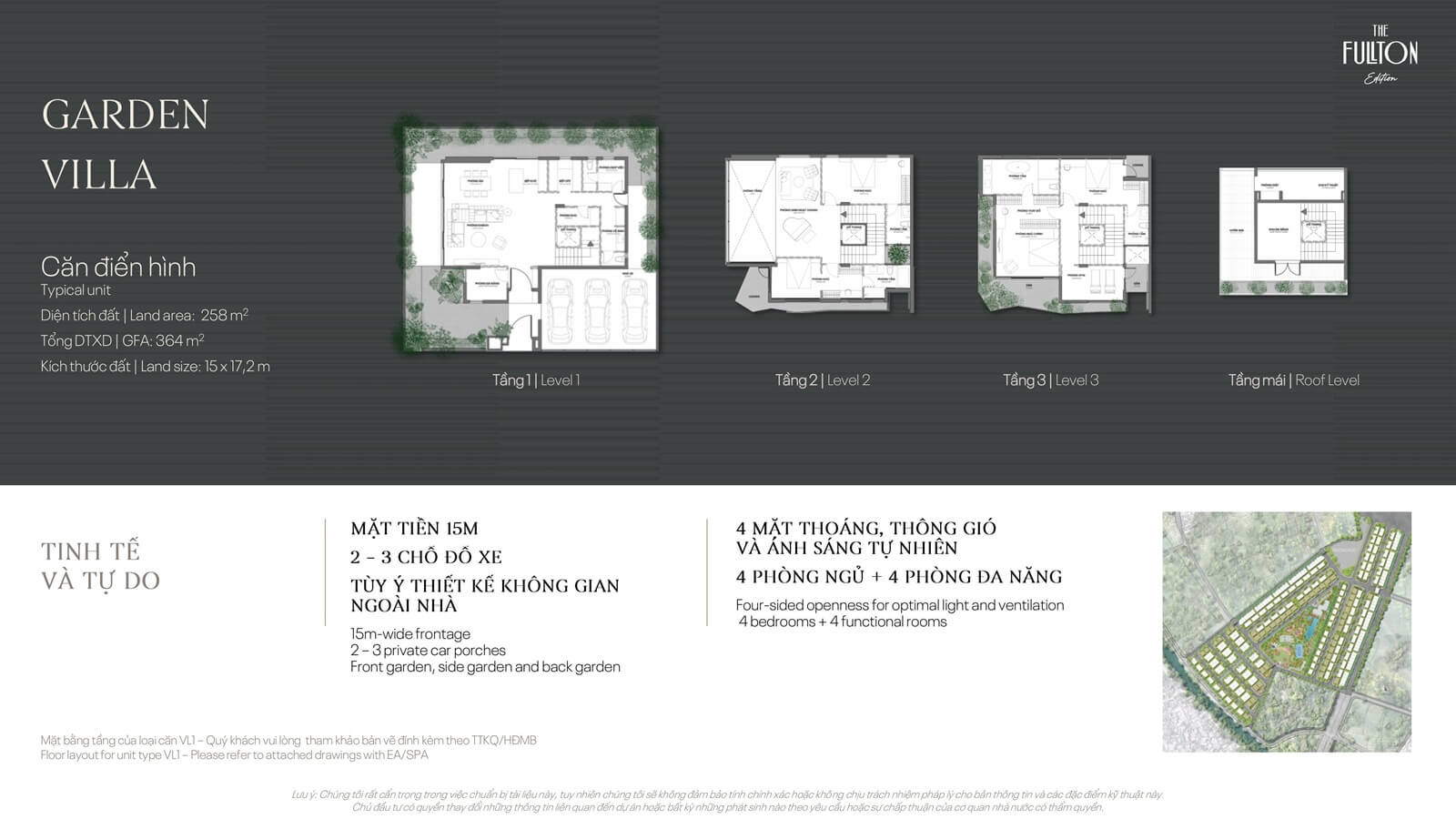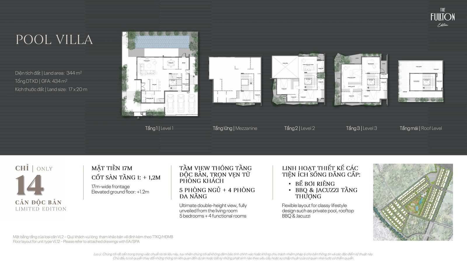 Pool Villa The Fullton Edition là dòng sản phẩm cao nhất tại dự án The Fullton giai đoạn 1, với 14 căn biệt thự độc bản, sở hữu mặt tiền ấn tượng 17m và cốt sàn tầng 1 nâng cao +1,2m, mang đến tầm view thông tầng độc đáo, trọn vẹn từ phòng khách. Với 5 phòng ngủ và 4 phòng đa năng, không gian được thiết kế linh hoạt để tích hợp các tiện ích sống đẳng cấp như bể bơi riêng, khu vực BBQ và Jacuzzi tầng thượng. Đây là lựa chọn hoàn hảo cho những ai tìm kiếm một không gian sống sang trọng, riêng tư và đậm chất cá nhân hóa.