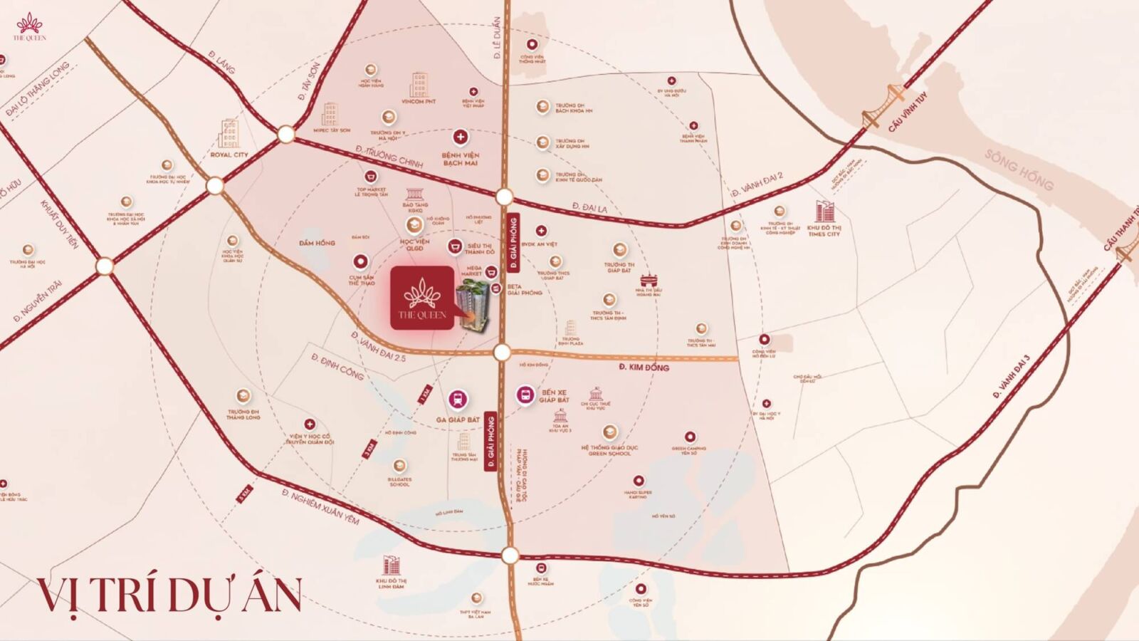 Tọa lạc tại 360 Giải Phóng, The Queen sở hữu vị trí chiến lược, ngay cửa ngõ trung tâm Thủ đô, kết nối trực tiếp với các quận lớn như Thanh Xuân, Hai Bà Trưng và Hoàng Mai. Dự án liền kề tuyến vành đai 2.5 và các trục giao thông huyết mạch như Quốc lộ 1A, cầu Thanh Trì, giúp cư dân dễ dàng di chuyển đến các tỉnh lân cận như Bắc Ninh, Hải Dương, Ninh Bình, Thanh Hóa.